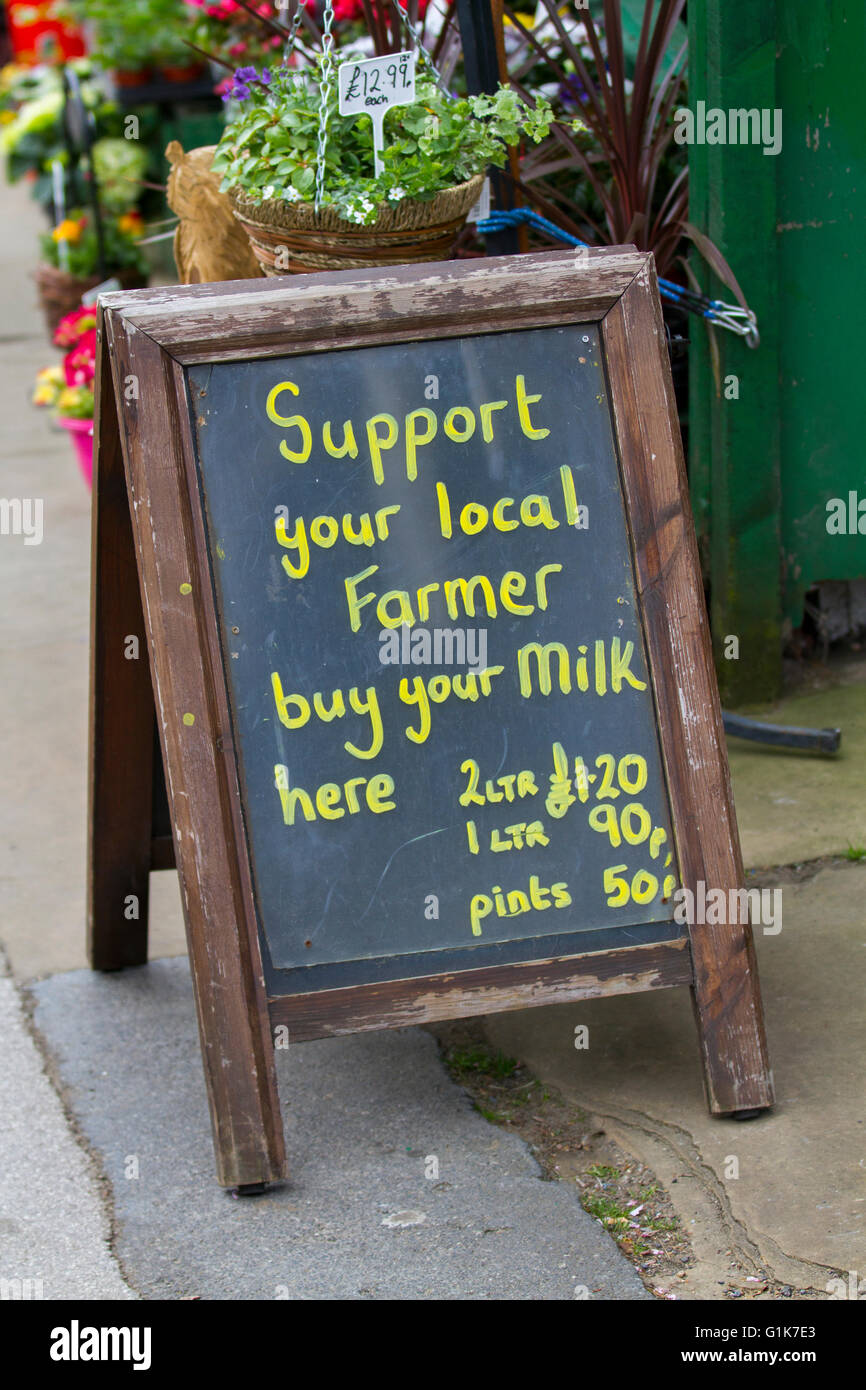 Small Local Greengrocer Business Sign Support Your Local Farmer Buy Your Bottled Milk Here Chalked A Board Sign Outside Grocers Shop At Haworth Yorkshire Uk Stock Photo Alamy